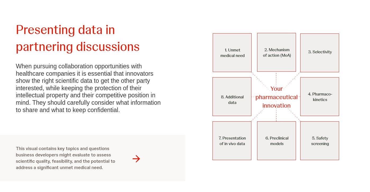 In this edition: Presenting data in partnering discussions When pursuing collaboration opportunities with healthcare companies it is essential that innovators show the right scientific data to get the other party interested, while keeping the protection of their intellectual property and their competitive position in mind. They should carefully consider what information to share and what to keep confidential. Your pharmaceutical innovation This visual contains key topics and questions business developers…